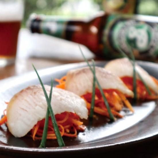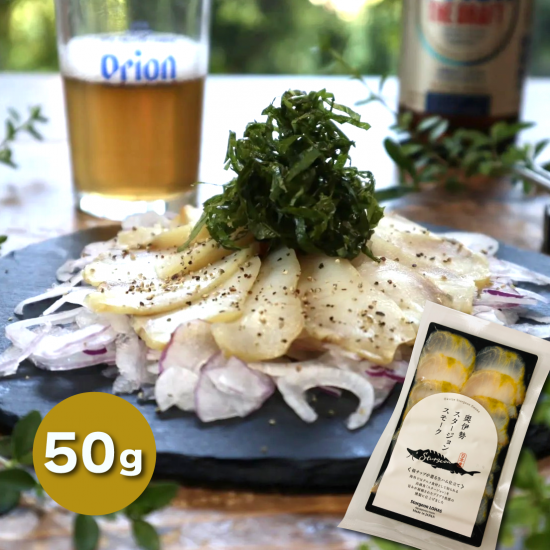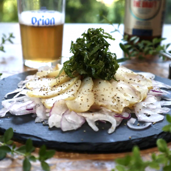 スライスした玉ねぎの上にスタージョン(チョウザメ)のスモークを並べてブラックペッパーをちらすだけで、美味しいおつまみに。